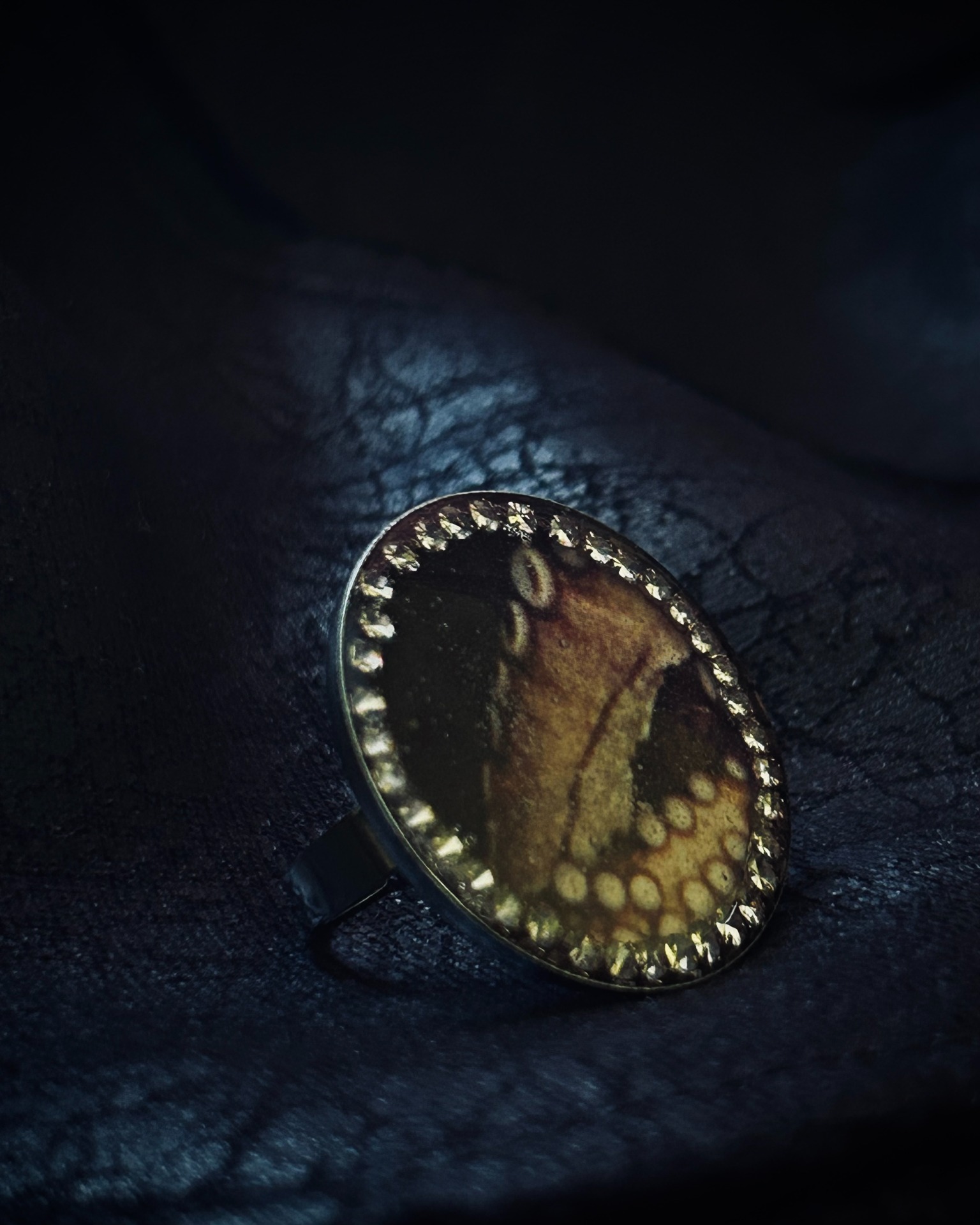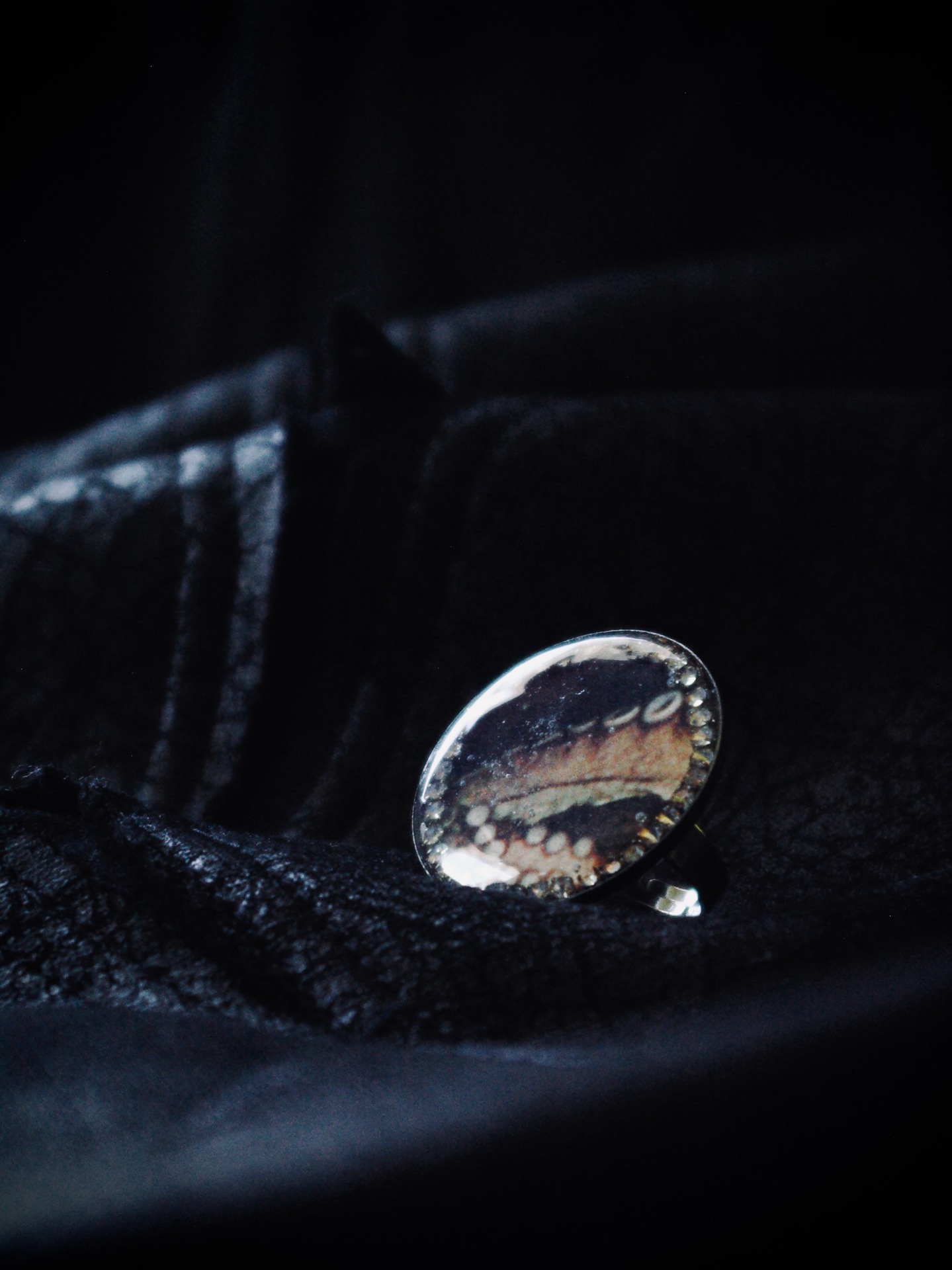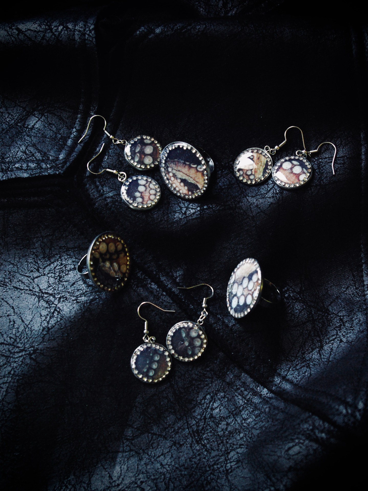 Materiaalit: korupohjat, strassit, paperikuvat, hartsipinnoite, nikkelivapaat korvakorukoukut, nikkelivapaa sormuspohja